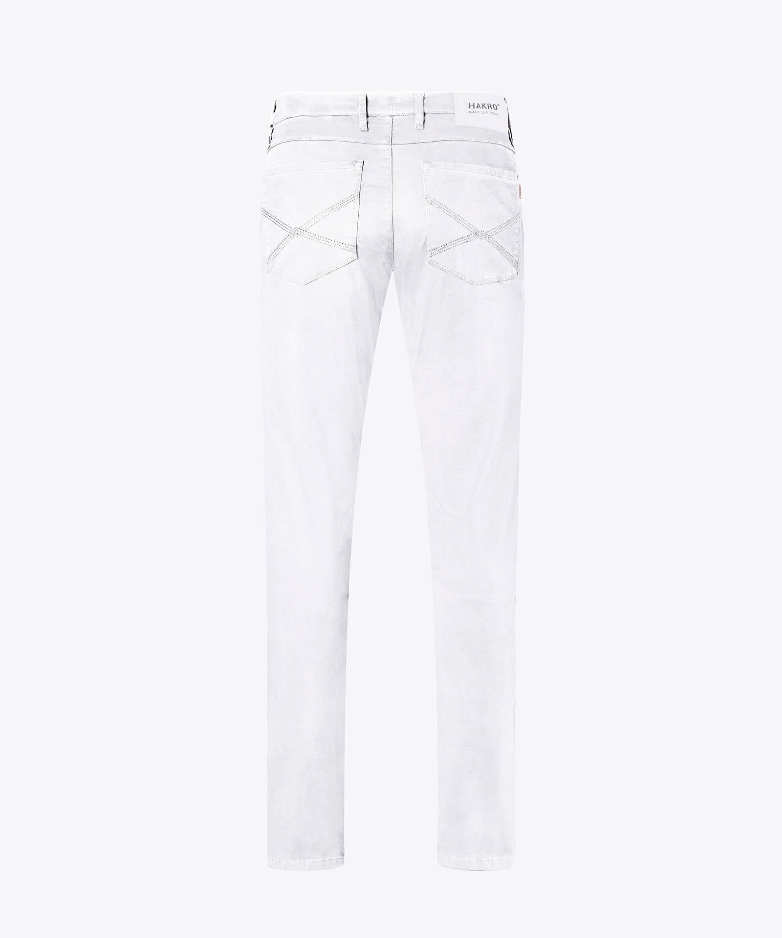 Leger geschnittene Chinohose im 5-Pocket-Design. Zwei Eingrifftaschen, Münztasche, zwei Gesäßtaschen, Gürtelschlaufen und Reißverschluss von YKK®. Dekorativer Knopf mit HAKRO Schriftzug und Patch am hinteren Bund. Stickerei auf den Gesäßtaschen, am Reißverschlussuntertritt und am Bund. Paspelierung mit Futterstoff am Innenbund sowie an den unteren Außenbeinnähten, so dass die Hose auch gekrempelt getragen