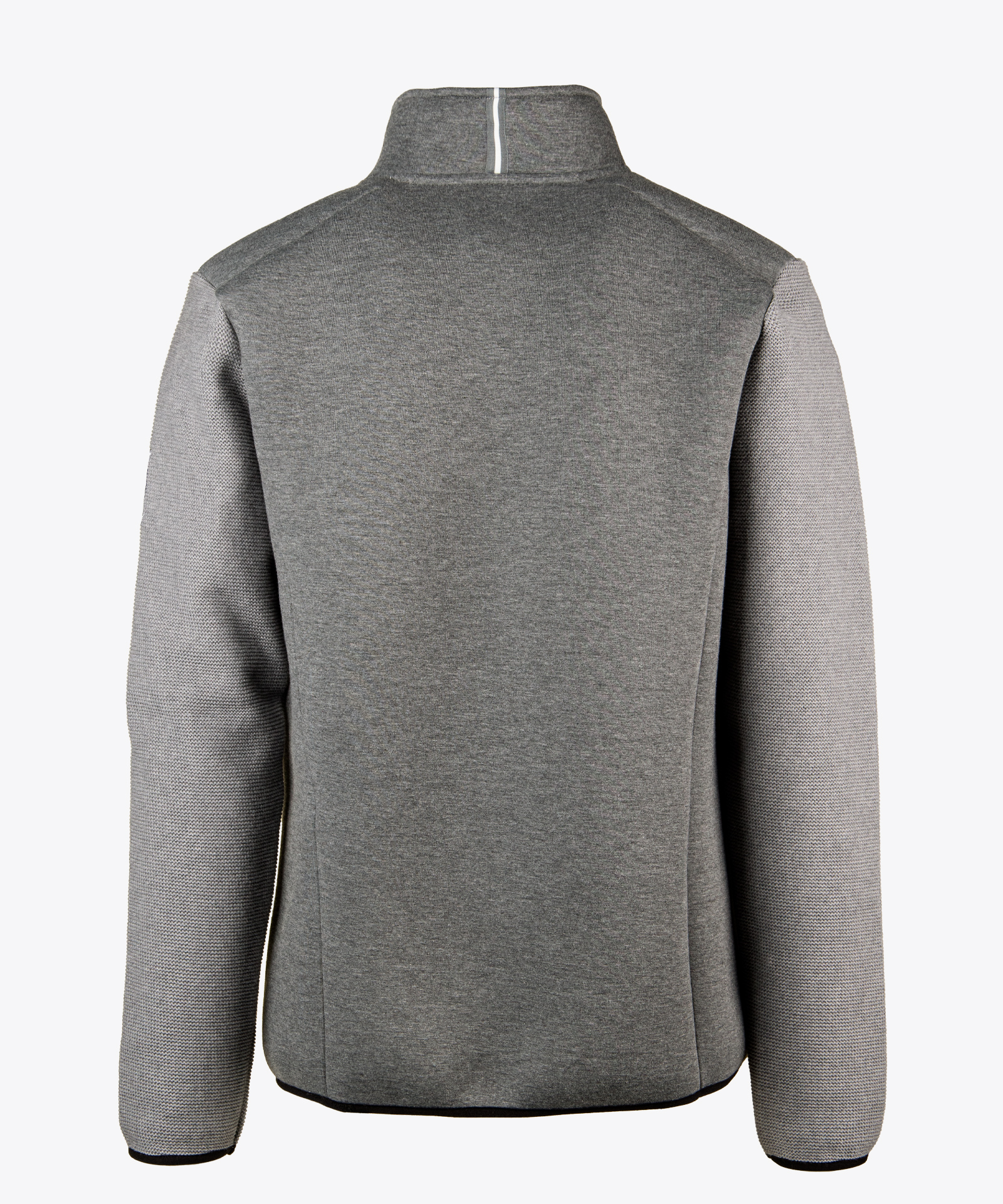 Zip Jacke im Material Mix, Hauptmaterial besteht aus zwei Schichten mit einem Monofil- Garn für optimale Wärmeregulierung, die die warme Luft im Winter und die kühle Luft im Sommer speichert, Ärmel und der Einsatz an der Brust sind aus einem gestrickten Stoff welcher der Jacke ein angenehmes Tragegefühl verleiht. Elastikeinfassung am Saum, Ärmelsaum und am Frontreißverschluss, 2 Nahtzipptaschen, 1 Brusttaschenzipp,